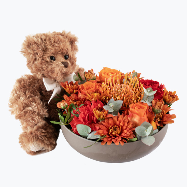 En nydelig dekorasjon til glede og omtanke som leveres sammen med vår herlige myke, Florabjørn. Enkelt å motta - kan settes rett på bordet. Skålen er miljøvennlig og produsert av nedbrytbare gjenbruksmaterialer. Et godt valg rett og slett!
